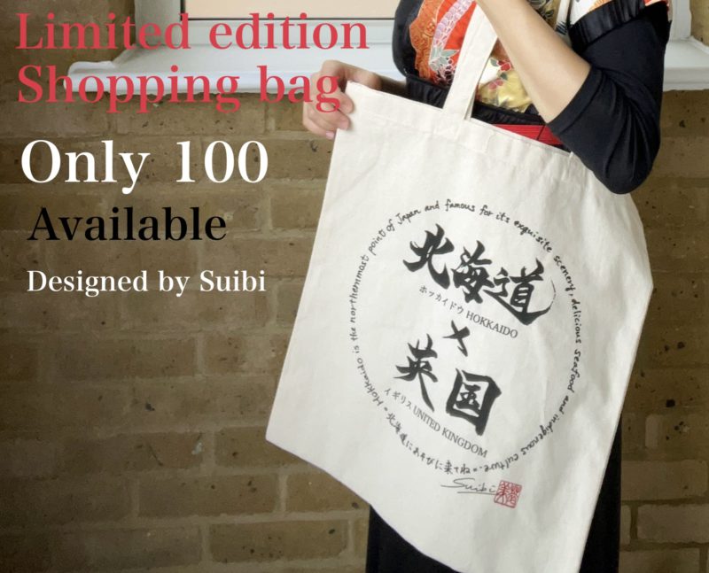 書道家としては昨年同様、萃美デザインの【北海道x英国バッグ】を販売。my bagを持ちながらチラシ配りをしていたら、何人かに「それはどこで買えるの?」と興味を持ってもらえたので、デザインとしてはひとまず合格点をあげたいと思います。
