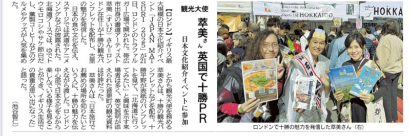 今年もとかち観光大使としてHOKKAIDOブースに参加し、十勝観光連盟様や音更町議員様からお預かりした「十勝観光パンフレット」「音更町観光資料」を来場者の皆さんに配布しつつ、HOKKAIDOブースでお買い物していただくよう誘導する任務を頑張りました。